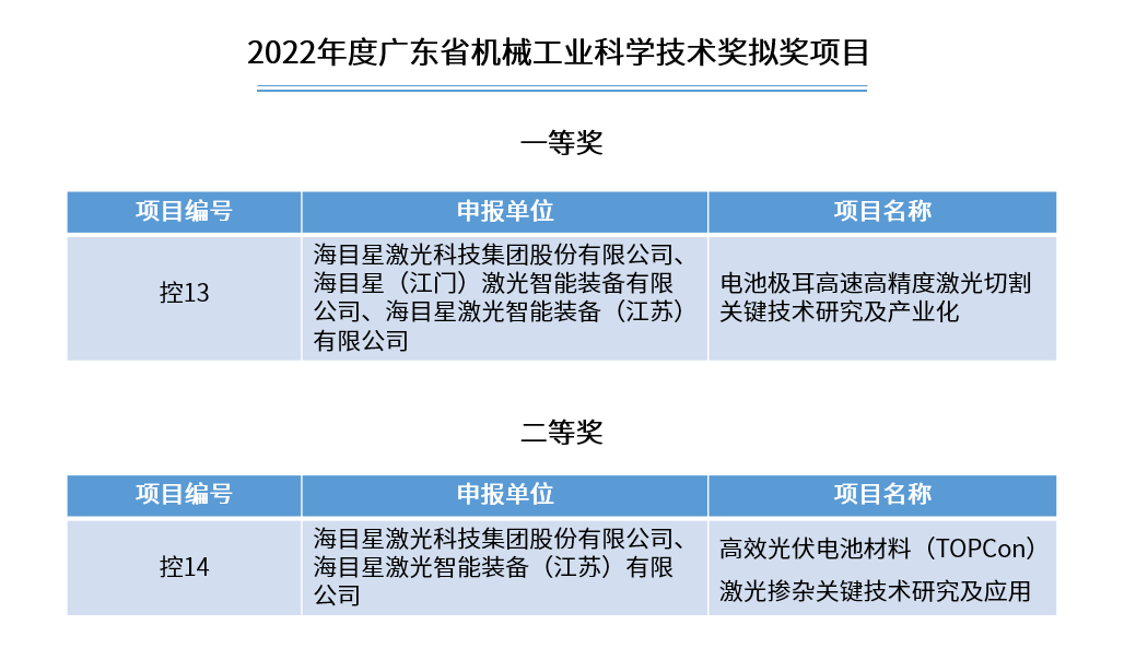 近日,廣東省機械工程學(xué)會通過官方渠道公示2022年度廣東省機械工業(yè)科學(xué)技術(shù)獎獲獎項目,海目星申報的《電池極耳高速高精度切割關(guān)鍵技術(shù)研究及產(chǎn)業(yè)化》《高效光伏電池材料(TOPCon)激光摻雜關(guān)鍵技術(shù)研究及應(yīng)用》項目分獲科學(xué)技術(shù)獎一、二等獎。